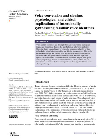| Title: | Voice conversion and cloning: psychological and ethical implications of intentionally synthesising familiar voice identities |