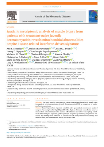 Spatial transcriptomic analysis of muscle biopsy from patients with treatment-naive juvenile dermatomyositis reveals mitochondrial abnormalities despite disease-related interferon-driven signature.