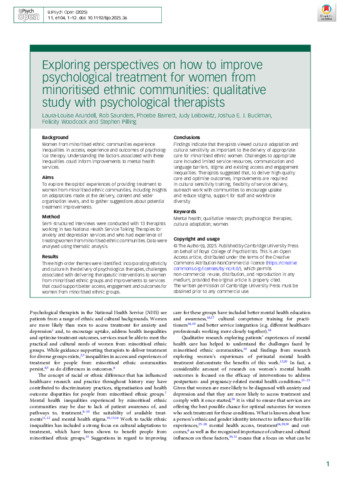 | Title: | Exploring perspectives on how to improve psychological treatment for women from minoritised ethnic communities: qualitative study with psychological therapists |