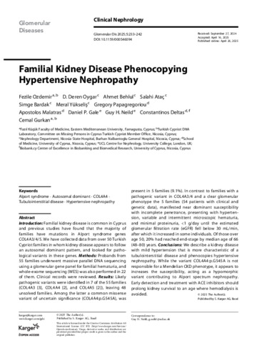 INTRODUCTION: Familial kidney disease is common in Cyprus and previous studies have found that the majority of families have mutations in Alport syndrome genes COL4A3/4/5. We have collected data from over 50 Turkish Cypriot families in whom kidney disease appears to follow an autosomal dominant pattern, and looked for pathological variants in these genes. METHODS: Probands from 55 families underwent massive parallel DNA sequencing using a glomerular gene panel for familial hematuria, and whole-exome sequencing (WES) was also performed in 22 of them. Clinical records were reviewed. RESULTS: Likely pathogenic variants were identified in 7 of the 55 families (COL4A3 [3], COL4A4 [2], and COL4A5 [2]), leaving 48 unsolved families. Among the latter a common missense variant of uncertain significance (COL4A4:p.G545A), was present in 5 families (9.1%). In contrast to families with a pathogenic variant in COL4A3/4 and a clear glomerular phenotype the 5 families (54 patients with clinical and genetic data), manifested near dominant susceptibility with incomplete penetrance, presenting with hypertension, variable and intermittent microscopic hematuria, and minimal proteinuria, <1 g/day until the estimated glomerular filtration rate (eGFR) fell below 30 mL/min, after which it increased in some individuals. Of those over age 50, 20% had reached end-stage by median age of 66 (48-80) years. CONCLUSIONS: We describe a kidney disease with mild hypertension that is more characteristic of a tubulointerstitial disease and phenocopies hypertensive nephropathy. While the variant COL4A4:p.G545A is not responsible for a Mendelian CKD phenotype, it appears to increases the susceptibility, acting as a hypomorphic variant contributing to Alport spectrum nephropathy. Early detection and treatment with ACE inhibitors should prolong kidney survival to an age where hemodialysis is avoided.