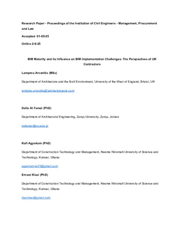 | Title: | BIM maturity and its influence on BIM implementation challenges: the perspectives of UK contractors |