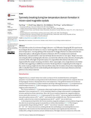 | Title: | Symmetry breaking during low-temperature domain formation in micron-sized magnetite crystals |