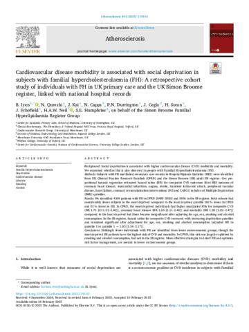 | Title: | Cardiovascular disease morbidity is associated with social deprivation in subjects with familial hypercholesterolaemia (FH): A retrospective cohort study of individuals with FH in UK primary care and the UK Simon Broome register, linked with national hospital records |