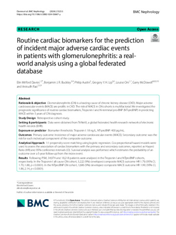 Title: | Routine cardiac biomarkers for the prediction of incident major adverse cardiac events in patients with glomerulonephritis: a real-world analysis using a global federated database |