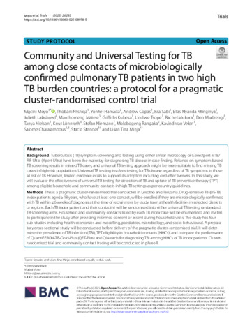 Title: | Community and Universal Testing for TB among close contacts of microbiologically confirmed pulmonary TB patients in two high TB burden countries: a protocol for a pragmatic cluster-randomised control trial |