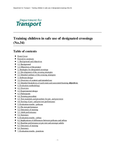 Despite the intention that they should increase pedestrian safety, designated crossings (that is, marked out points for road crossing such as stand-alone signal-controlled crossings, zebras, and junction lights with a pedestrian phase) are known to be problematic in character (Carsten, Sherborne & Rothengatter, 1998). Bly, Dix & Stephenson (1999), comparing child pedestrian injury events in Great Britain, France and the Netherlands, found that children in Britain face a higher risk when using designated crossings. The most recent figures (2001) on pedestrian casualties for the UK bear out this point, with cases at all levels of severity tending to be more common at designated crossing sites than within 50 metres of them. Whilst the precise reasons for this are unclear, it may be the result of children in Britain also making less use of such crossings, and thus having a poorer grasp of what behaviours are appropriate at these points and why. It would therefore be valuable to ascertain what children do understand about designated crossings, and to attempt to ameliorate any gaps via educational intervention, especially since there has been little previous Department for Transport - Training children in safe use of designated crossings (No.34) work of this kind. Indeed, at present, none of the practical pedestrian training schemes for children in use in the UK address safe use of designated crossings. Task analysis reveals that safe use of designated crossings is highly complex, involving between 14 and 19 distinct behaviours (depending on crossing type), deployed in three separate phases (preparation to use, looking immediately prior to crossing, and execution). In addition, integration of these elements into a co-ordinated sequence that can be used at different sites almost certainly depends on a conceptual understanding of the specific reasons for engaging in each of them. Given this complexity, it would perhaps be unsurprising if children’s road-crossing performance at designated crossings were poor. It also raises questions, though, about what forms of educational intervention would be helpful. Practical training methods (that is, where children make actual crossing decisions and related judgements under supervised and structured conditions, and receive feedback on the adequacy of those decisions and judgements) have been shown to be effective in improving pedestrian skills in children as young as 5 years (Thomson & Whelan, 1997). Moreover, the emphasis these methods place on learning via the shaping of behaviour in context is particularly suited to the complexity of designated crossings.