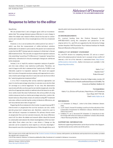 We are pleased that Li and colleagues agree with our recommendation that “the average between-group difference in score change is where the debate and research efforts should be focused to contextualize and evaluate the clinical meaningfulness of the true treatment effect.” However, Li et al. do not address the central point of our article,1, 2 which was that the measurement of within-individual variation attributable to treatment is precluded by the parallel-arm randomized controlled trial (RCT) design typically employed in Alzheimer's disease (AD) treatment trials. This was why we argued that responder analyses risk committing “causal fraud” if differences in “responder” proportions (defined by a threshold of clinically meaningful change) are attributed to the treatment.