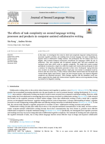 Title: | The effects of task complexity on second language writing processes and products in computer-assisted collaborative writing |