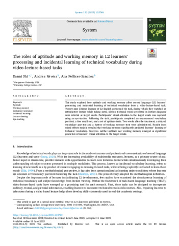 Title: | The roles of aptitude and working memory in L2 learners' processing and incidental learning of technical vocabulary during video-lecture-based tasks |