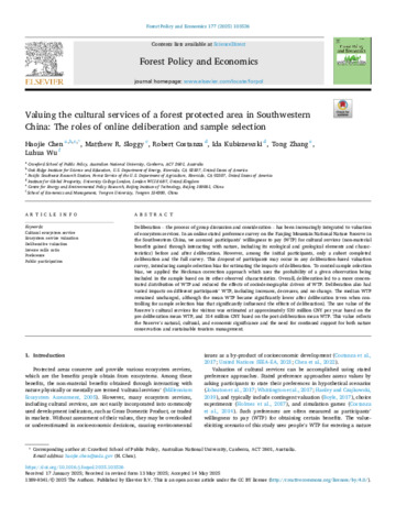 | Title: | Valuing the cultural services of a forest protected area in Southwestern China: The roles of online deliberation and sample selection |