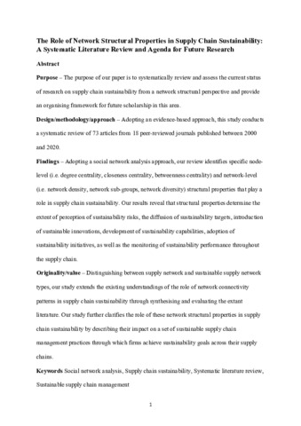 Title: | The role of network structural properties in supply chain sustainability: a systematic literature review and agenda for future research |