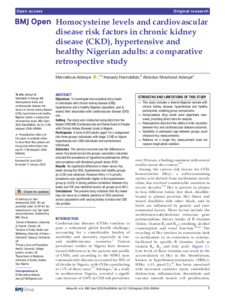 | Title: | Homocysteine levels and cardiovascular disease risk factors in chronic kidney disease (CKD), hypertensive and healthy Nigerian adults: a comparative retrospective study |