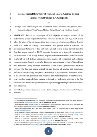 | Title: | Geomechanical Behaviour of Fine and Coarse-Grained Copper Tailings from Brazilian IOCG Deposits |