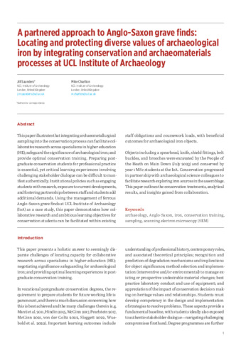 This paper illustrates that integrating archaeometallurgical sampling into the conservation process can facilitate collaborative research across specialisms in higher education (HE); safeguard the significance of archaeological iron; and provide optimal conservation training. Preparing postgraduate conservation students for professional practice is essential, yet critical learning experiences involving challenging stakeholder dialogue can be difficult to manifest authentically. Institutional policies such as engaging students with research, exposure to current developments, and fostering partnerships between staff and students add additional demands. Using the management of ferrous Anglo-Saxon grave finds at UCL Institute of Archaeology (IoA) as a case study, this paper demonstrates how collaborative research and ambitious learning objectives for conservation students can be facilitated within existing staff obligations and coursework loads, with beneficial outcomes for archaeological iron objects. Objects including a spearhead, knife, shield fittings, belt buckles, and brooches were excavated by the People of the Heath on Main Down (July 2023) and conserved by year 1 MSc students at the IoA. Conservation progressed in partnership with archaeological science colleagues to facilitate research exploring iron sources in the assemblage. This paper outlines the conservation treatments, analytical results, and insights gained from collaboration.