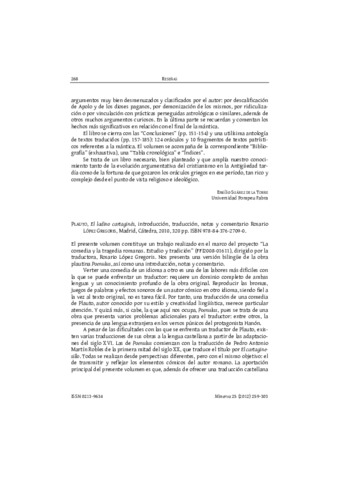 Title: | PLAUTO, El ladino cartaginés, introducción, traducción, notas y comentario Rosario LÓPEZ GREGORIS, Madrid, Cátedra, 2010, 320 pp. ISBN 978-84-376-2709-0 |