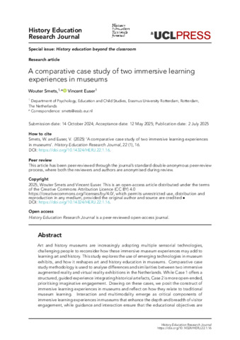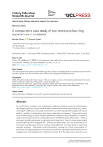 Art and history museums are increasingly adopting multiple sensorial technologies, challenging people to reconsider how these immersive museum experiences may add to learning art and history. This study explores the use of emerging technologies in museum exhibits, and how it reshapes art and history education in museums. Comparative case study methodology is used to analyse differences and similarities between two immersive augmented reality and virtual reality exhibitions in the Netherlands. While Case 1 offers a structured, guided experience integrating historical artefacts, Case 2 is more open-ended, prioritising imaginative engagement. Drawing on these cases, we posit the construct of immersive learning experiences in museums and reflect on how they relate to traditional museum learning. Interaction and multimodality emerge as critical components of immersive learning experiences in museums that enhance the depth and breadth of visitor engagement, while guidance and interaction ensure that the educational objectives are met without stifling individual curiosity. Both cases vary to a large degree in the way in which they integrate these aspects of learning into their design.