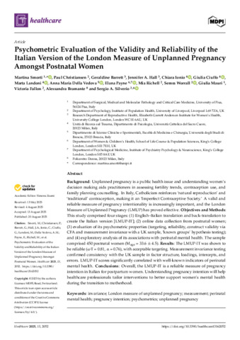 | Title: | Psychometric Evaluation of the Validity and Reliability of the Italian Version of the London Measure of Unplanned Pregnancy Amongst Postnatal Women |