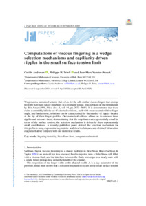 Title: | Computations of viscous fingering in a wedge: selection mechanisms and capillarity-driven ripples in the small surface tension limit |