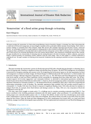 This paper examines the ‘resurrection’ of a flood action group following a decade of inactivity, through a ‘co-learning’ lens. Flood action groups play a crucial role in UK flood risk management, yet many struggle to maintain activity, particularly without sustained external funding. This is, in fact, a common challenge in community-based DRR worldwide. While DRR research often prioritises high-impact/low-frequency hazards, ‘small-scale disasters’ are increasingly recognised as equally significant. Selforganisation is often essential for sustainable DRR in resource-constrained contexts. The paper develops a preliminary co-learning framework to analyse the flood action group's revival. While ‘co-learning’ and ‘co-creation’ are widely used in DRR research, the conceptual interrogation of the terms remains underdeveloped. After clarifying the relationship between these concepts, the paper identifies five key characteristics of colearning from the existing literature in the field of education as follows: solidarity, equal power balance, reciprocal learning, new knowledge creation, collective action for social change. These are then applied as a tentative framework in analysing the case. The paper concludes by reflecting on the framework’s limitations but also exploring its potential to advance co-learning research in DRR.