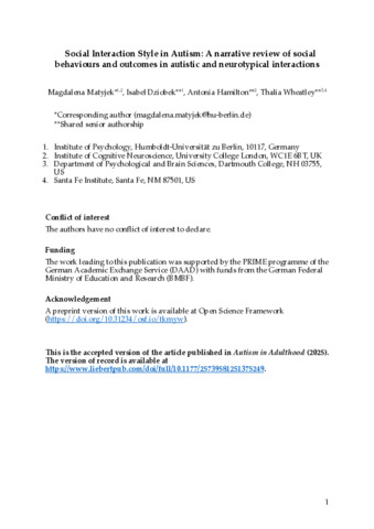 Title: | Social Interaction Style in Autism: A Narrative Review of Social Behaviors and Outcomes in Autistic and Neurotypical Interactions |