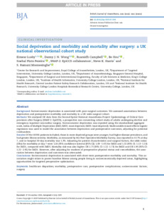 | Title: | Social deprivation and morbidity and mortality after surgery: a UK national observational cohort study |