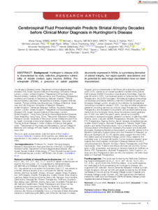 Title: | Cerebrospinal Fluid Proenkephalin Predicts Striatal Atrophy Decades before Clinical Motor Diagnosis in Huntington's Disease |
