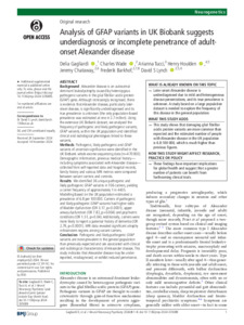 Analysis of GFAP variants in UK Biobank suggests underdiagnosis or incomplete penetrance of adult-onset Alexander disease.