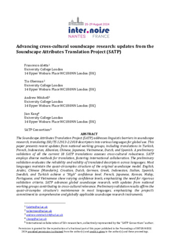 Title: | Advancing cross-cultural soundscape research: updates from the Soundscape Attributes Translation Project (SATP) |