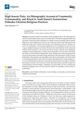 This paper explores the material culture of religious life on the Greek island of Anafi during the peak tourism season of summer 2023. Through ethnographic fieldwork, the paper examines the public celebration of a number of feasts coinciding with the summer high season: the Transfiguration of Christ, one of the Great Feasts of the Orthodox Church, celebrated on the sixth of August; the Dormition of the Theotokos (Mary the “Birthgiver of God”) on the fifteenth, with evening Supplications to the Theotokos in church on every August weekday leading up to the feast; the feast and commemoration of the immensely popular Saint Fanourios on the twenty-seventh of August, with the main celebration centering on the preceding day’s vespers; and, in September, the major feast of the island: the Nativity of the Theotokos (8 September), which unfolds into four-days-long festivities, due to the main shrine of the island being dedicated to the protectress of Anafi, Panayia Kalamiotissa. This paper focuses especially on the role of commensality and shared meals in maintaining kinship ties and social communion. Ritualized festive eating emerges as a way of consolidating the community of permanent island residents and diasporic islanders returning for summer. The continuity of these embodied practices provides insight into Anafiot identity and lived religion. Ultimately, this paper reflects on how contemporary Orthodox theologians have re-discovered the priority of materiality and the senses in ecclesial life.
