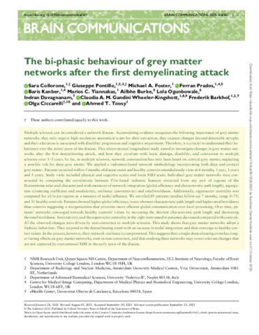 | Title: | The bi-phasic behaviour of grey matter networks after the first demyelinating attack |