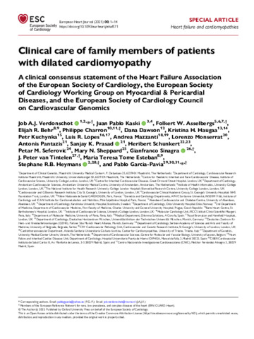 Title: | Clinical care of family members of patients with dilated cardiomyopathy: A clinical consensus statement of the Heart Failure Association of the European Society of Cardiology, the European Society of Cardiology Working Group on Myocardial & Pericardial Diseases, and the European Society of Cardiology Council on Cardiovascular Genomics |