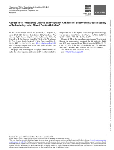 Title: | Correction to: “Preexisting Diabetes and Pregnancy: An Endocrine Society and European Society of Endocrinology Joint Clinical Practice Guideline” |