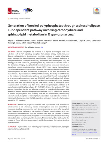 Title: | Generation of inositol polyphosphates through a phospholipase C-independent pathway involving carbohydrate and sphingolipid metabolism in Trypanosoma cruzi |