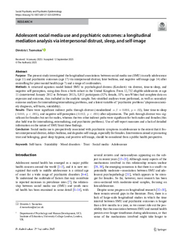 Title: | Adolescent social media use and psychiatric outcomes: a longitudinal mediation analysis via interpersonal distrust, sleep, and self-image |