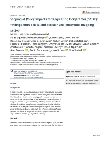 Title: | Scoping of Policy Impacts for Regulating E-cigarettes (SPIRE): findings from a data and decision analytic model mapping project [version 1; peer review: awaiting peer review] |