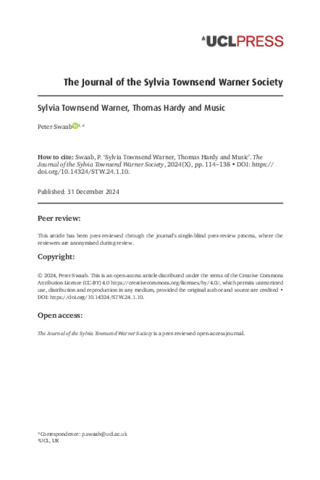 This article is mainly a documentary record of Sylvia Townsend Warner’s interest in Thomas Hardy’s writing, with a particular focus on its musical qualities and possibilities, as against a critical exploration of the role of music and song in the works of the two writers. It starts with a discussion of the three songs Warner composed from Hardy’s poems when she was working as a composer in the later 1910s. The article presents a previously unpublished 1919 letter from Warner to Hardy thanking him for permission to publish her settings, and gives a context for this plan in relation to her other musical compositions of this period, reproducing some of Warner’s manuscript music. It goes on to describe some performances of the Hardy songs, and includes comments on these from Dr Richard Hall, who edited them for performance. The article ends by briefly citing and discussing Warner’s later remarks on Hardy’s works, especially in the context of Britten’s song cycle Winter Words and Evelyn Hardy’s 1954 critical biography.