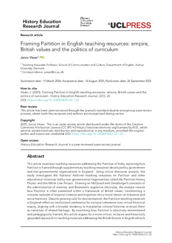 This article examines teaching resources addressing the Partition of India, exploring how Partition is framed through supplementary teaching resources developed by government and non-governmental organisations in England. Using critical discourse analysis, the study investigates the National Archives teaching resources on Partition and other educational initiatives led by non-governmental organisations called the Partition History Project and the White Line Project. Drawing on McQuaid and Gensburger’s concepts of the administration of memory and Bernstein’s regulative discourse, the analysis reveals how Partition is often presented within a framework of British values, transforming a complex episode of imperial violence and migration into a moral lesson on tolerance and social harmony. Despite growing calls for decolonisation, the Partition teaching materials in England reflect an institutional preference for national coherence over critical historical inquiry, aligning with a broader tendency to marginalise colonial histories or recast them as narratives of shared heritage. By examining how Partition is selectively remembered and pedagogically framed, this article argues for a more critical, inclusive and historically grounded approach to teaching materials addressing the British Empire in English schools.