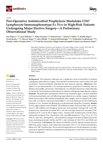 Title: | Peri-Operative Antimicrobial Prophylaxis Modulates CD4+ Lymphocyte Immunophenotype Ex Vivo in High-Risk Patients Undergoing Major Elective Surgery—A Preliminary Observational Study |