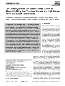 | Title: | Low-Defect Quantum Dot Lasers Directly Grown on Silicon Exhibiting Low Threshold Current and High Output Power at Elevated Temperatures |