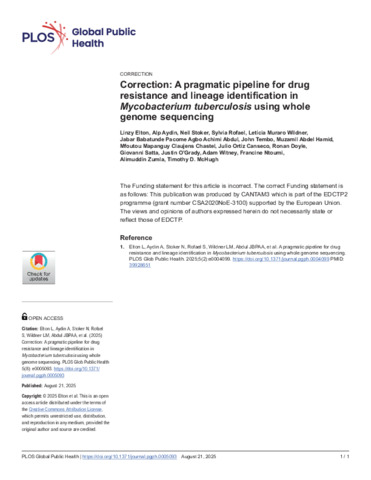 | Title: | Correction: A pragmatic pipeline for drug resistance and lineage identification in Mycobacterium tuberculosis using whole genome sequencing |