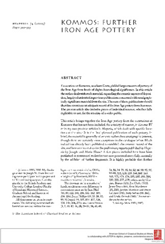 Excavations at Kommos, southern Crete, yielded large amounts of pottery of the Iron Age from levels of slight chronological significance. In this article the author deals with such material, expanding the ceramic aspects of deposition, largely adumbrated in previous publications concerned with stratigraphically significant material from the site. The sum of these publications should therefore constitute an adequate record of the Iron Age pottery from Kommos. The present article also includes pieces of individual interest, whether fully explicable or not, for the scrutiny of a wider public.
