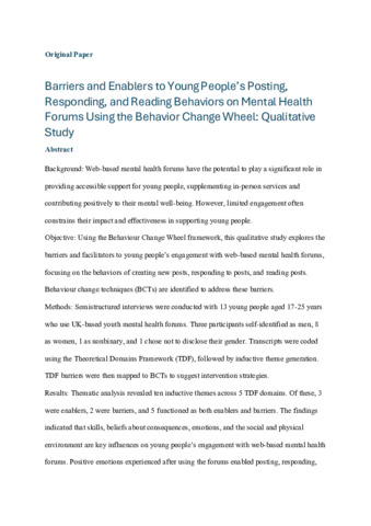 Barriers and enablers to young people’s posting, responding and reading behaviours on mental health forums using the Behaviour Change Wheel.