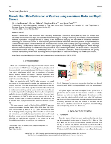 | Title: | Remote Heart Rate Estimation of Canines Using a Mmwave Radar and Depth Camera |
