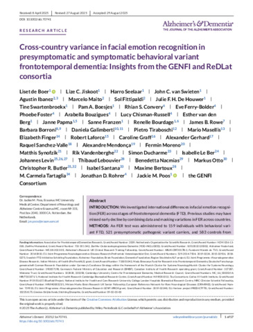 | Title: | Cross-country variance in facial emotion recognition in presymptomatic and symptomatic behavioral variant frontotemporal dementia: Insights from the GENFI and ReDLat consortia |