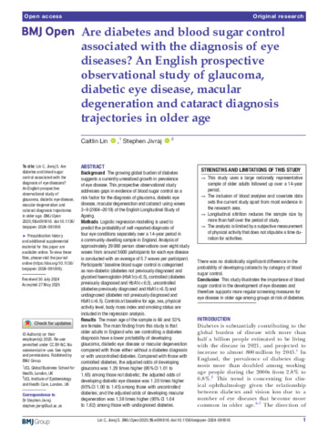 | Title: | Are diabetes and blood sugar control associated with the diagnosis of eye diseases? An English prospective observational study of glaucoma, diabetic eye disease, macular degeneration and cataract diagnosis trajectories in older age |