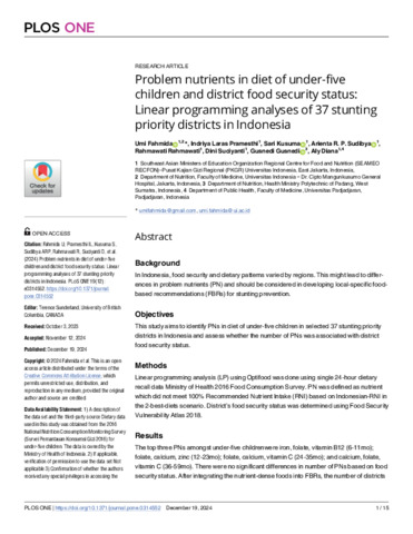 | Title: | Problem nutrients in diet of under-five children and district food security status: Linear programming analyses of 37 stunting priority districts in Indonesia |