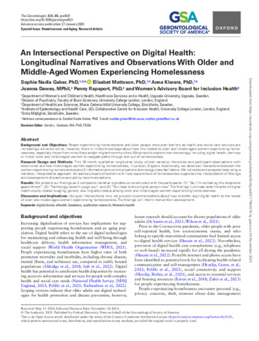 | Title: | An Intersectional Perspective on Digital Health: Longitudinal Narratives and Observations With Older and Middle-Aged Women Experiencing Homelessness |