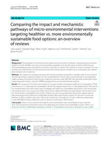 | Title: | Comparing the impact and mechanistic pathways of micro-environmental interventions targeting healthier vs. more environmentally sustainable food options: an overview of reviews |