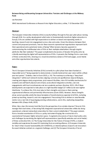 | Title: | Between Being and Becoming European Universities: Tensions and Challenges at the Midway Point |