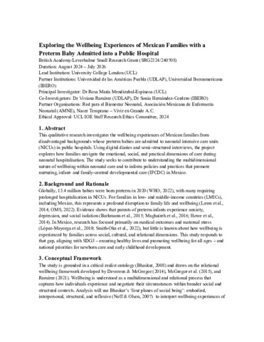 | Title: | Exploring the Wellbeing Experiences of Mexican Families with a Preterm Baby Admitted into a Public Hospital - Research Protocol |